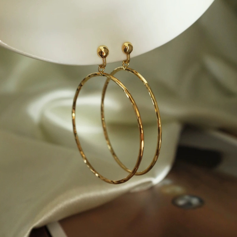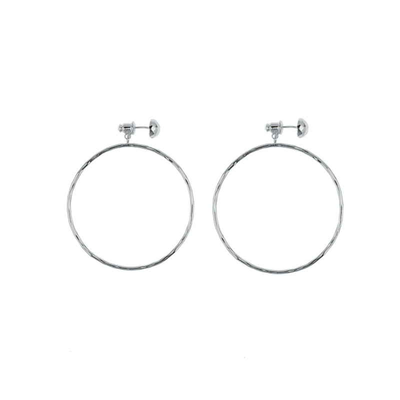 Each earring features a hammered hoop of shimmering sterling silver, attached to a beaded french ear wire. Each hoop has been made entirely by hand and hammered to achieve the finished look. They are then tumble polished for several hours for added strength and lustre. Although quite substantial looking, they are very light and comfortable in the ear. The highly polished surface reflects the light beautifully so that they glint with your every move!
